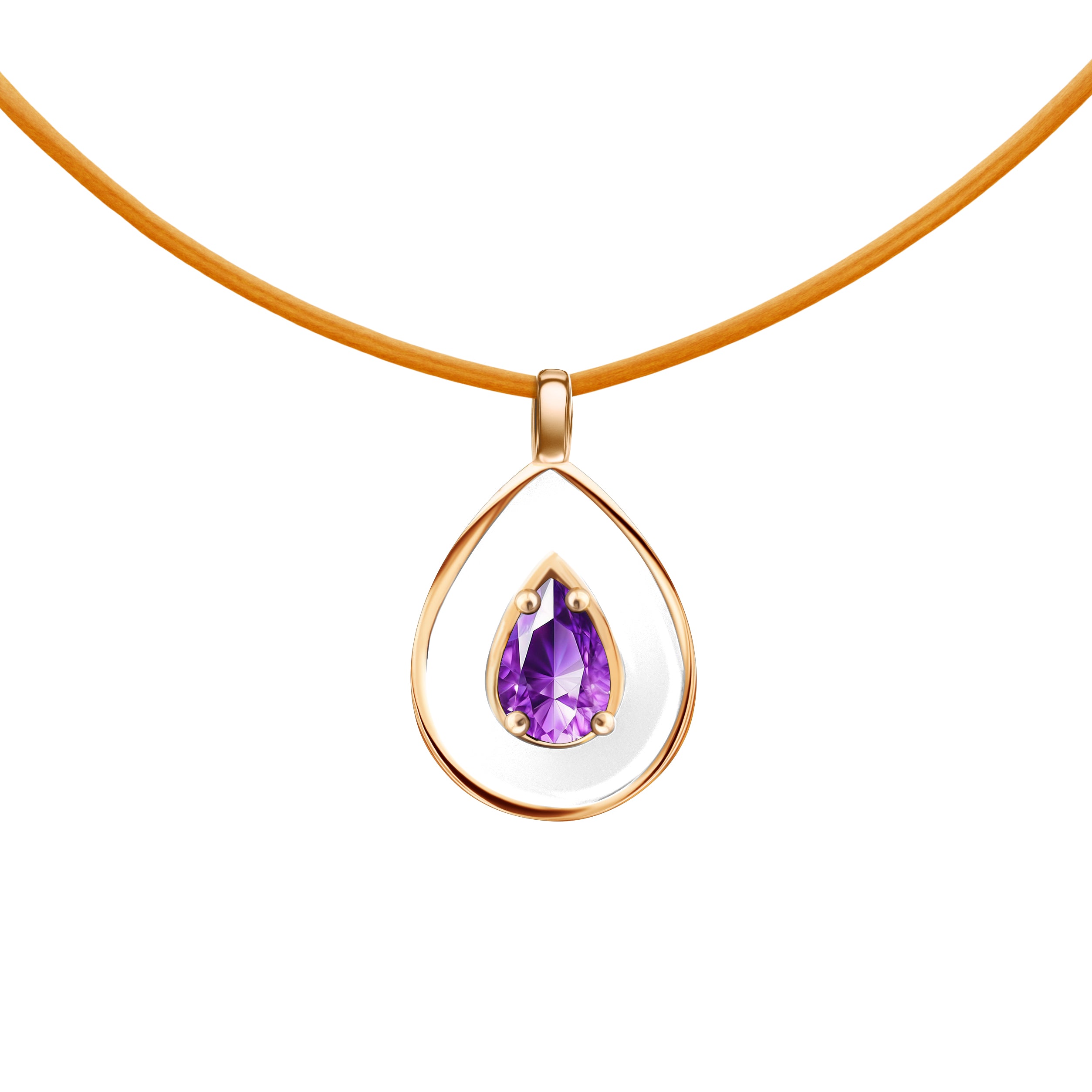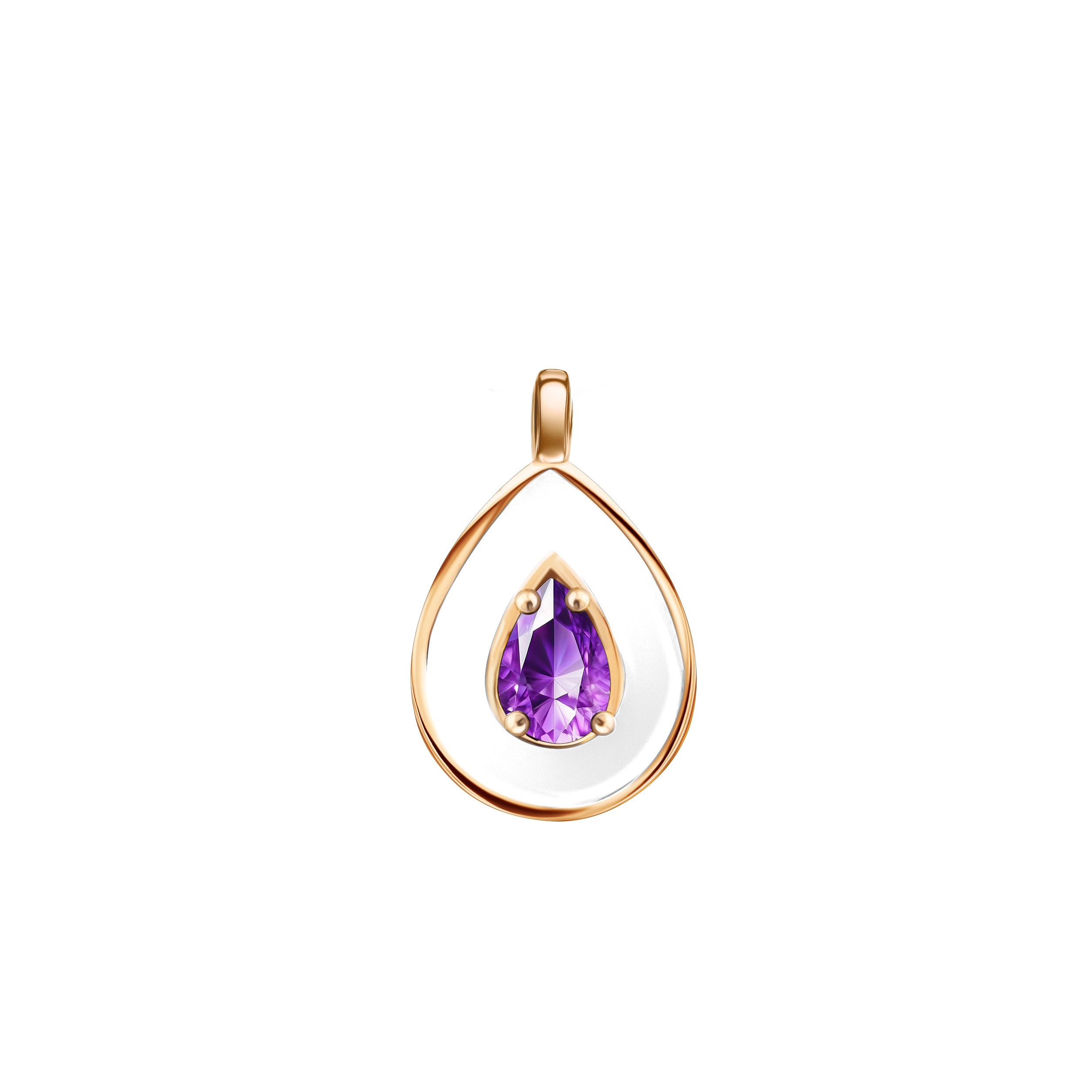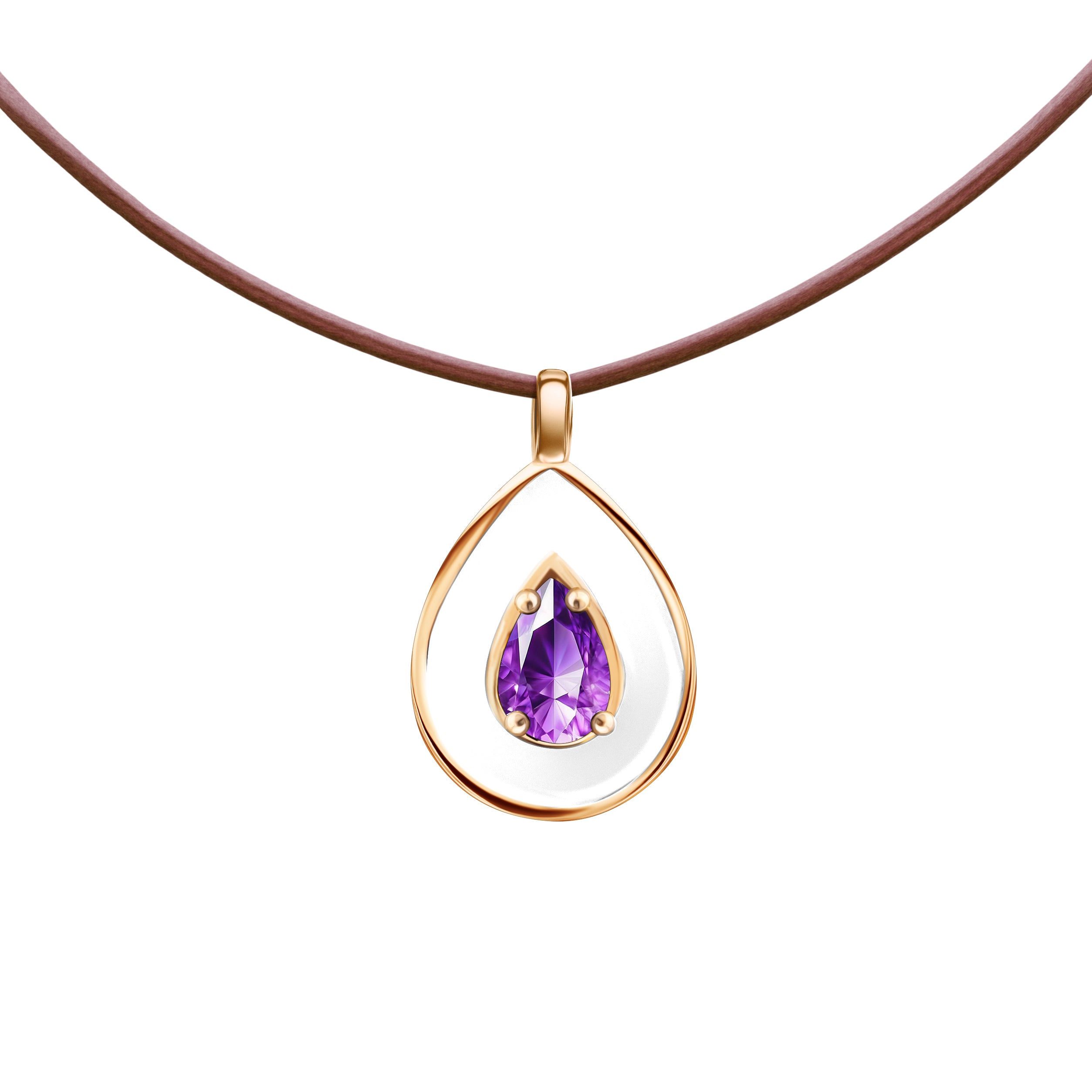 The Soprano pendant in white enamel features a pear-shaped amethyst, set in 18k rose gold.