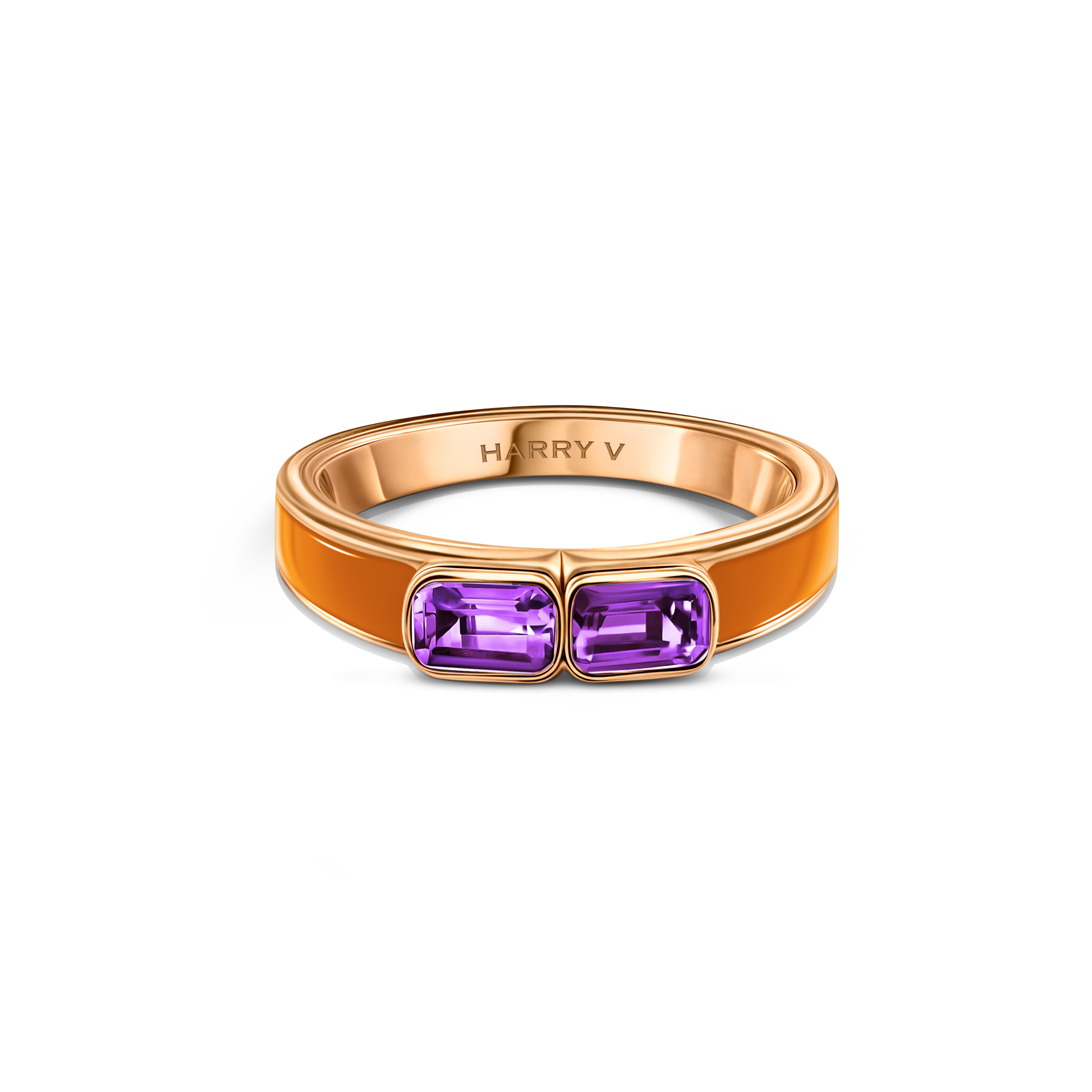 The DUO ring in 18k rose gold features an orange enamel inlay and two emerald-cut amethyst stones. Stack it with another DUO ring to complete your look.