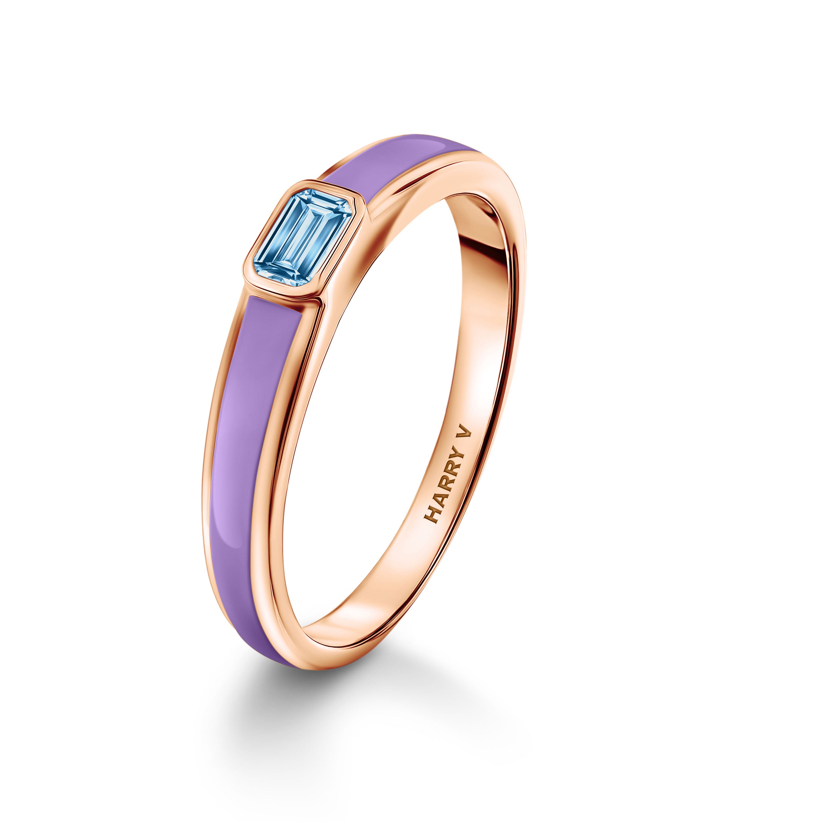 The Mini Uno ring in 18k rose gold features a purple enamel inlay and an emerald-cut blue topaz stone. This ring looks great in twos (or threes), pair it with another Uno, or Mini Uno ring.