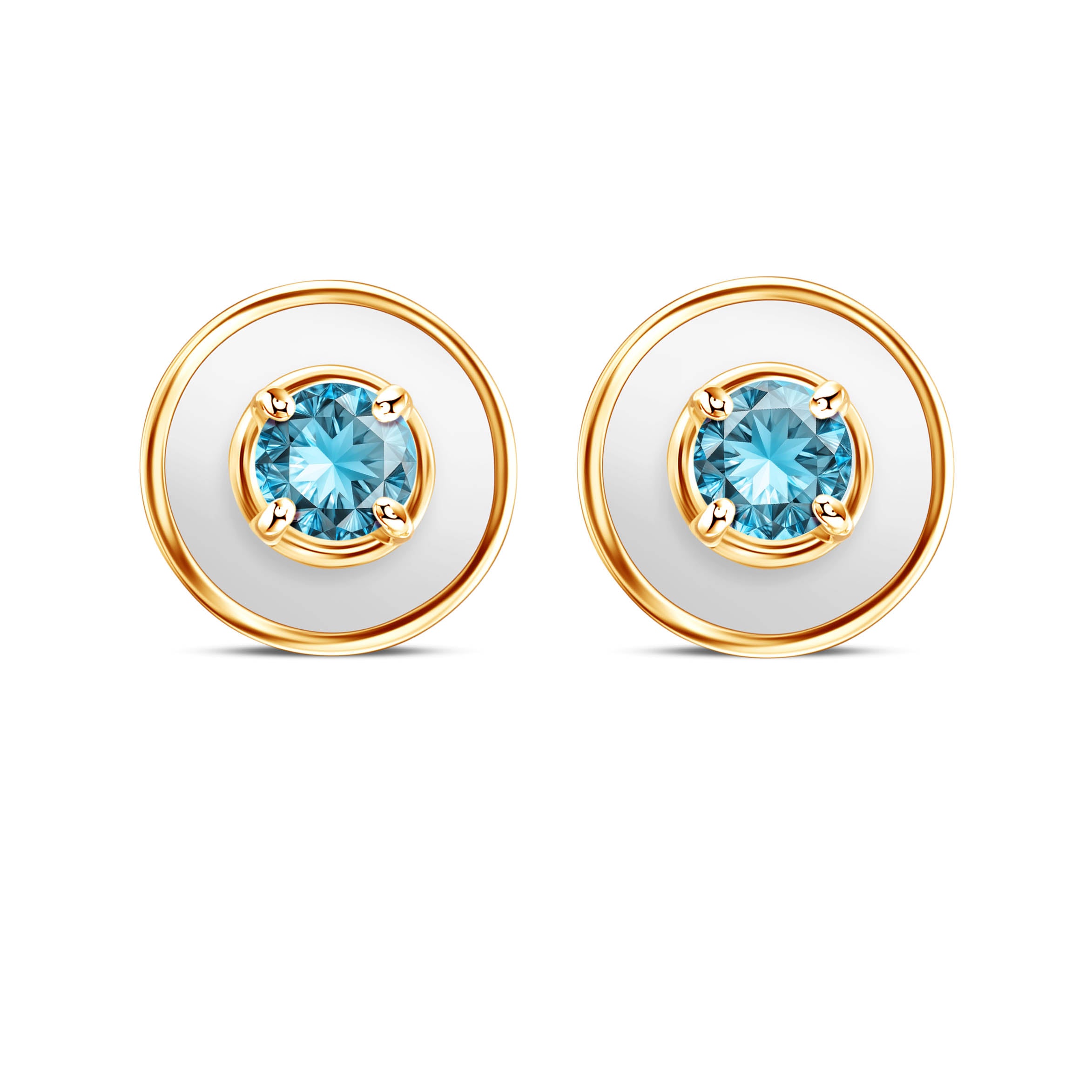 White enamel round studs feature two topaz stones set in 18k rose gold.